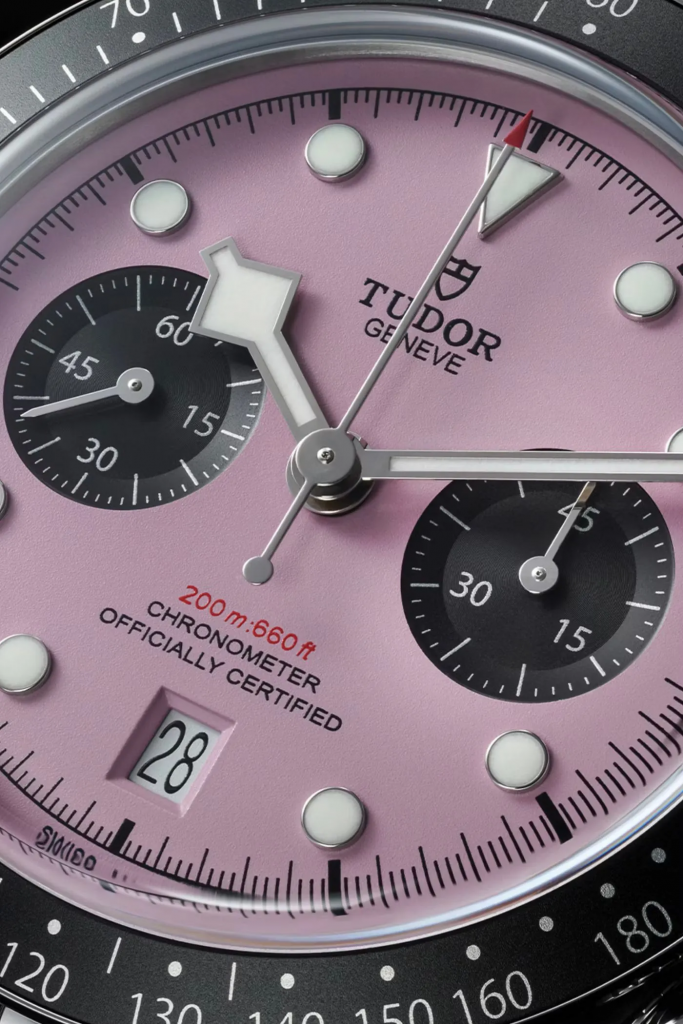 Por otro lado, las manecillas de reloj con acabado luminiscente son del tipo “Snowflake,” —lanzadas por Tudor en sus relojes de buceo Submariner en 1969—, mientras que los índices aplicados y rellenos de material luminiscente son fácilmente visibles en condiciones de poca luz. El rosa, en este caso un tono similar al algodón de azúcar, combina especialmente bien con los elementos negros y de acero del reloj.