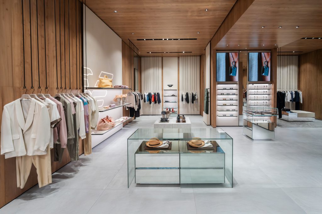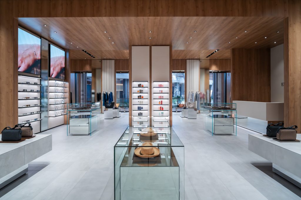 La experiencia Armani comienza incluso antes de cruzar el umbral. La boutique, diseñada con una fachada contemporánea y completamente transparente, actúa como un escaparate vivo que borra la línea entre el vibrante exterior del mall y el santuario de elegancia que aguarda dentro. Es un gesto de bienvenida, una invitación abierta a sumergirse en el mundo de Emporio Armani.