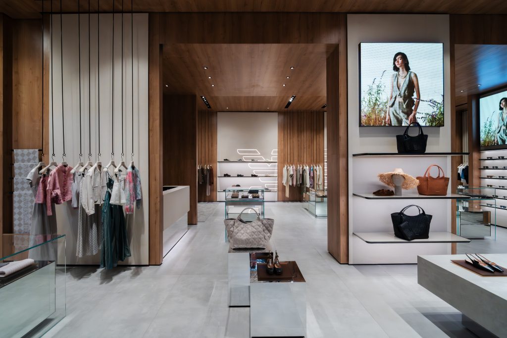 El corazón de la boutique late con los accesorios más deseados de la temporada, ocupando el centro del escenario. A lo largo de ambos lados, las colecciones de hombre y mujer se despliegan con elegancia, creando un entorno armonioso y equilibrado que permite descubrir cada pieza sin distracciones. Paneles de papel pintado de diseño se alternan con la madera, sirviendo como el fondo perfecto para exhibir la maestría de los cortes y la calidad de los materiales.
