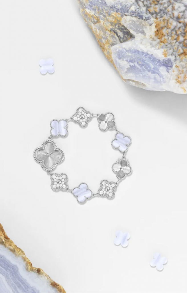 Una de las versiones conjuga el oro rosa con el nácar blanco y gris, cuya superficie iridiscente ofrece un brillo cambiante. La otra versión presenta tonos azulados de calcedonia que contrastan con el oro blanco y el nácar blanco. En ambas, el trabajo guilloché —una técnica de grabado que genera patrones de líneas radiantes— aporta un juego visual que refleja la maestría de los artesanos de la Maison. El contorno con cuentas, sello característico de Alhambra, completa el acabado con volumen y relieve.