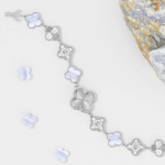 Una de las versiones conjuga el oro rosa con el nácar blanco y gris, cuya superficie iridiscente ofrece un brillo cambiante. La otra versión presenta tonos azulados de calcedonia que contrastan con el oro blanco y el nácar blanco. En ambas, el trabajo guilloché —una técnica de grabado que genera patrones de líneas radiantes— aporta un juego visual que refleja la maestría de los artesanos de la Maison. El contorno con cuentas, sello característico de Alhambra, completa el acabado con volumen y relieve.